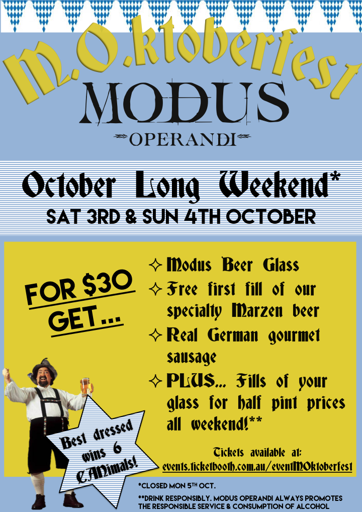 For $30 you get a take home Modus Operandi glass (475ml), a free fill of the specially created Marzen beer, a gourmet German sausage AND fills of your glass for 1/2 pint prices - all weekend!!