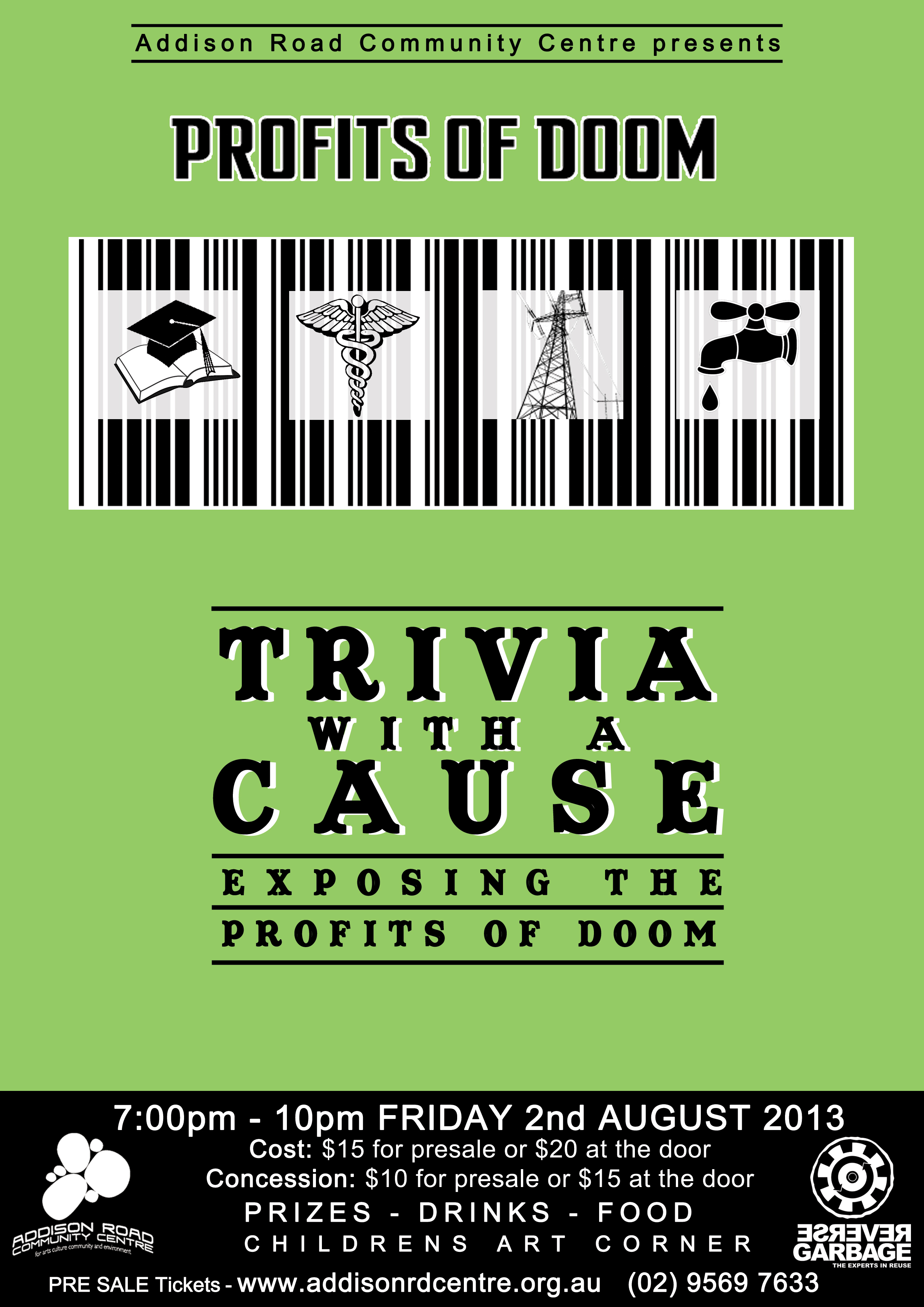 Come on down for a fun filled night of trivia, live music, food, drinks and prizes at Addison Road Community Centre. There will be a children's art corner where kids can win prizes. For all other information please contact [email protected]