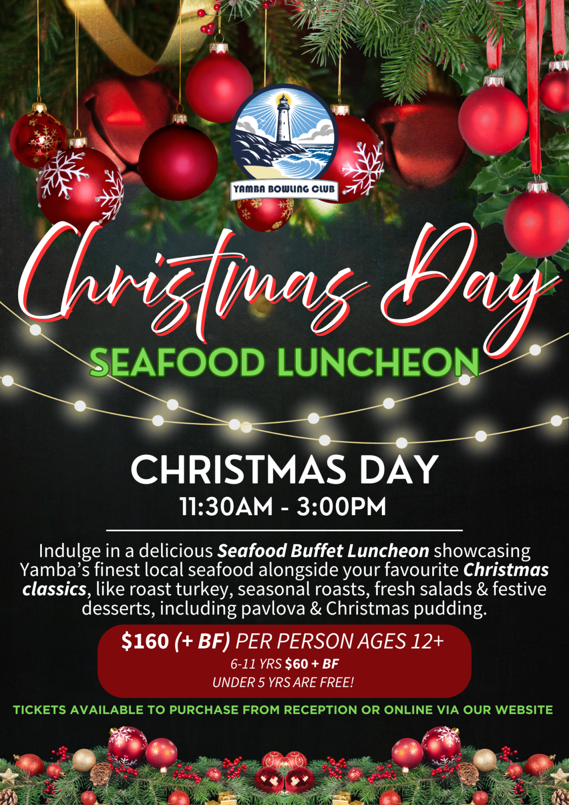 Celebrate Christmas Day with family and friends at Yamba Bowling Club’s Seafood Buffet Luncheon! Enjoy a festive feast featuring Yamba’s finest local seafood, perfectly complemented by your favourite Christmas classics - think succulent roast turkey, seasonal roasts, crisp salads, and indulgent desserts including pavlova and traditional Christmas pudding.