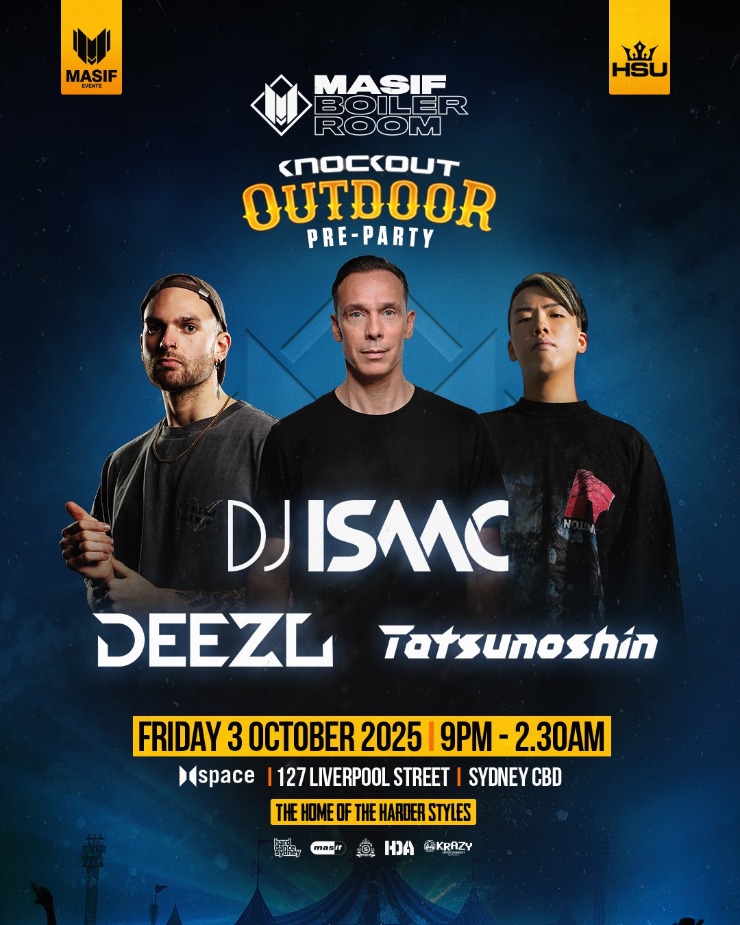 Masif and HSU present the Knockout Festival Official Pre Party featuring 3 internationals and a huge Australian lineup! Deezl, DJ Isaac and Tatsunoshin headline this years pre party with the Australian contingent covering two arenas with full on production! See YOU there!