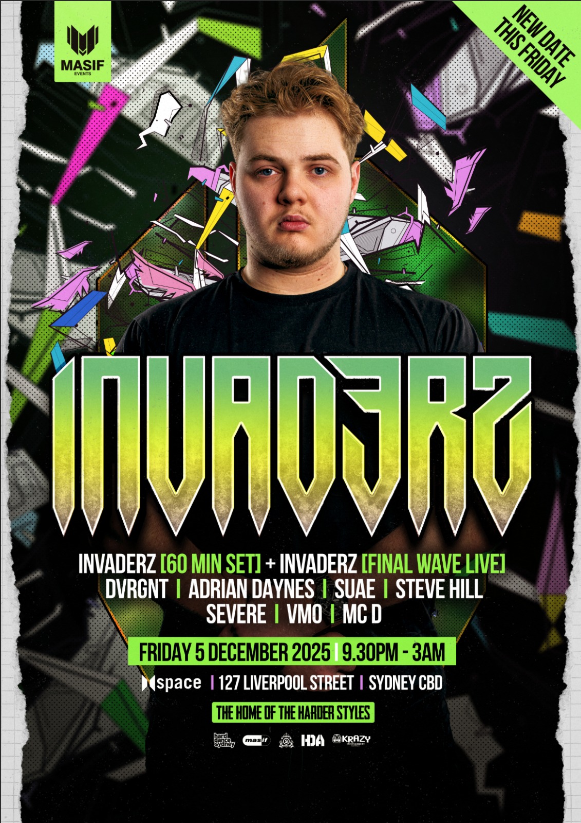 NEW DATE! THIS FRIDAY! December 5th! INVADERZ debuts at the HOME OF THE HARDER STYLES! It's going to be a MASIF weekend so reserve your spot on the dacnefloor early as this will be a two room event with full on production and peak time vibes from start to finish!