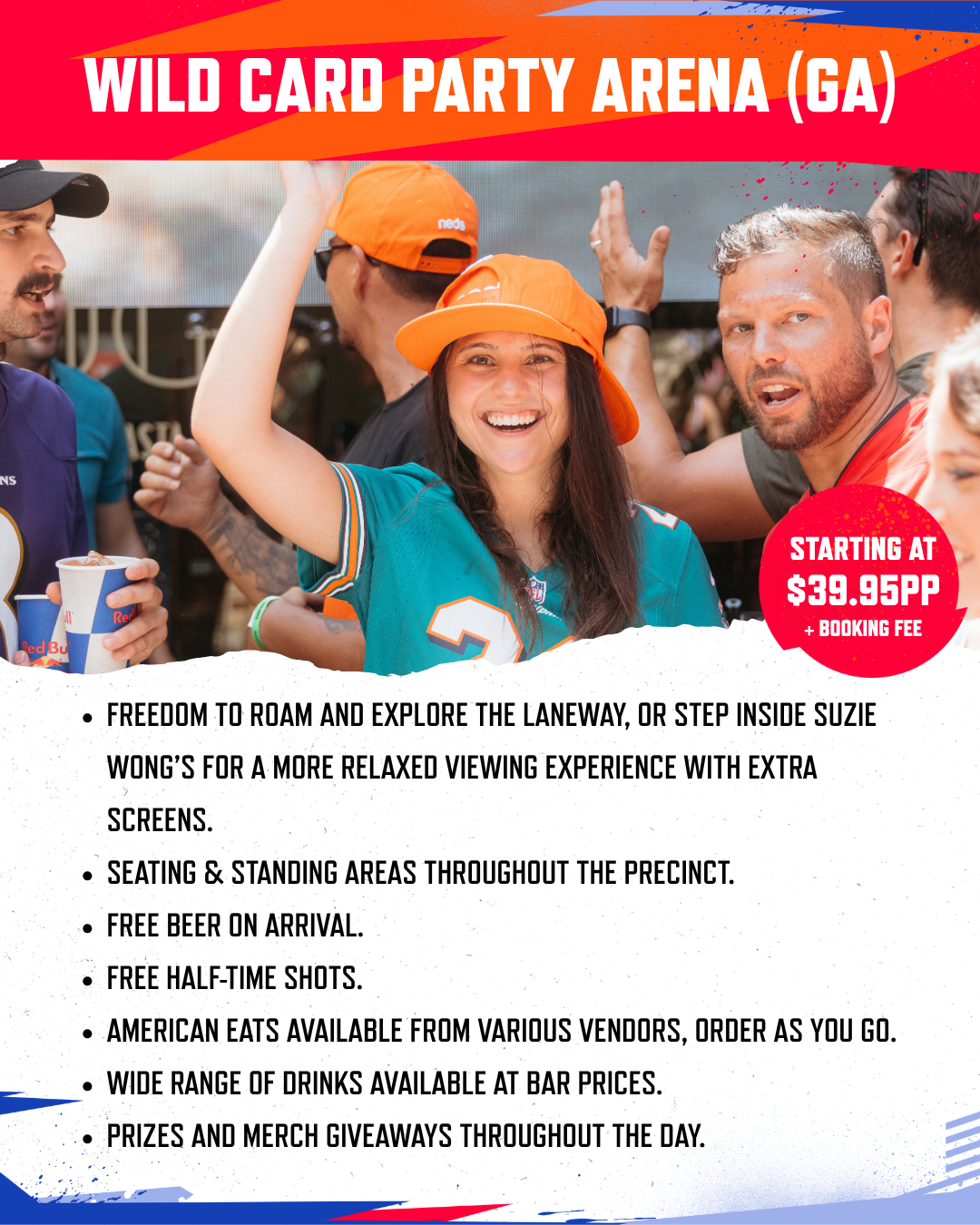 In the Wildcard Party Arena, laneway vendors will be serving up mouth-watering burgers, wings, ribs and more from their pay-as-you-go menus.