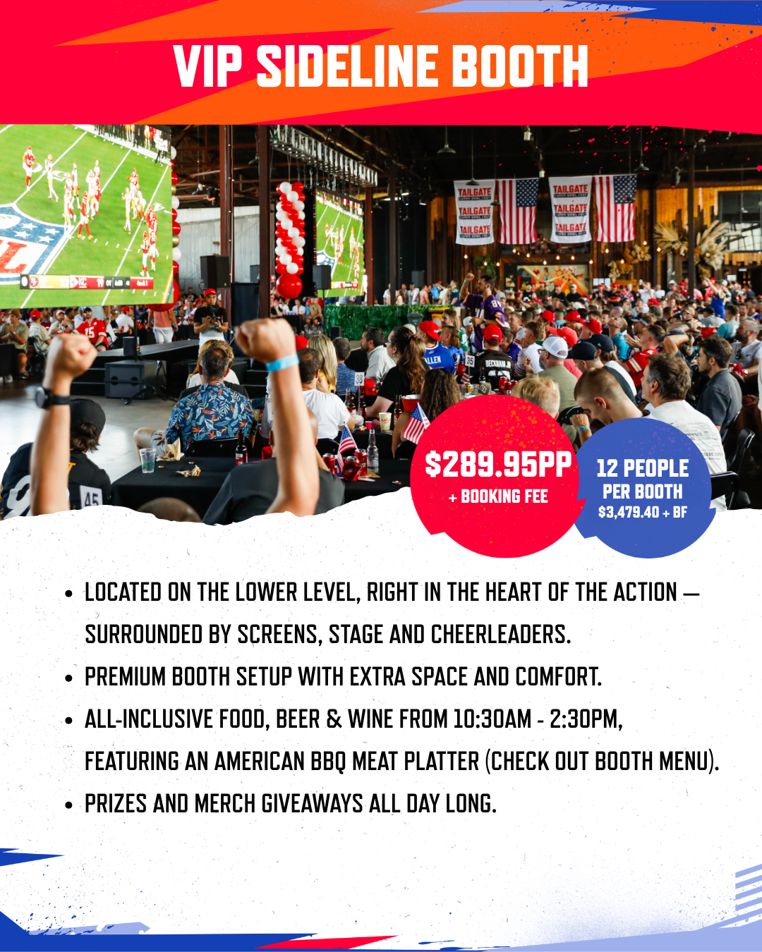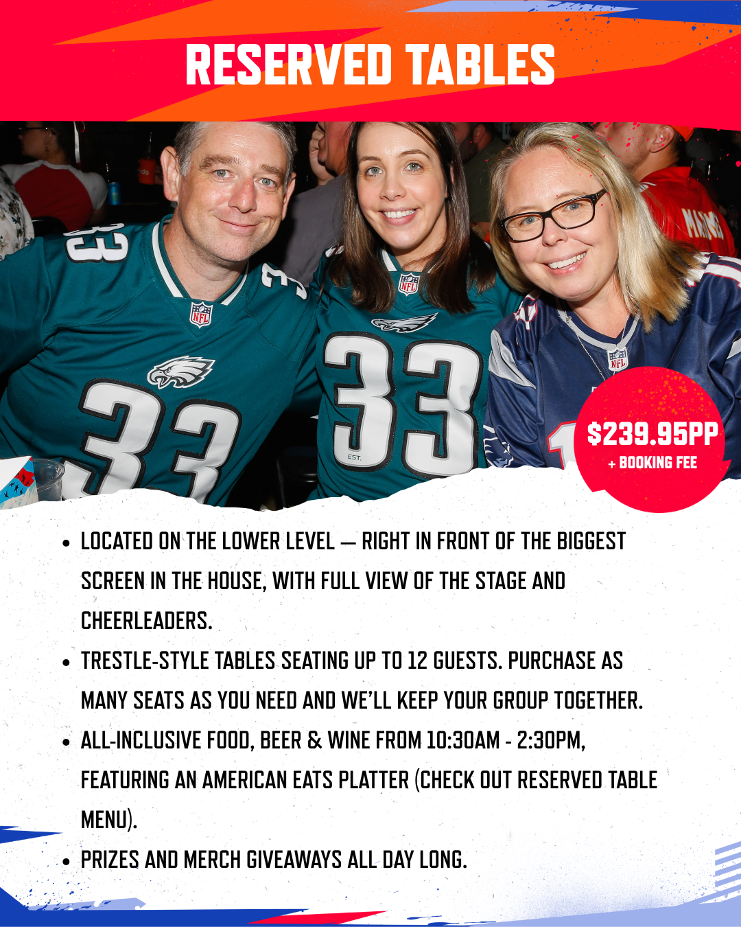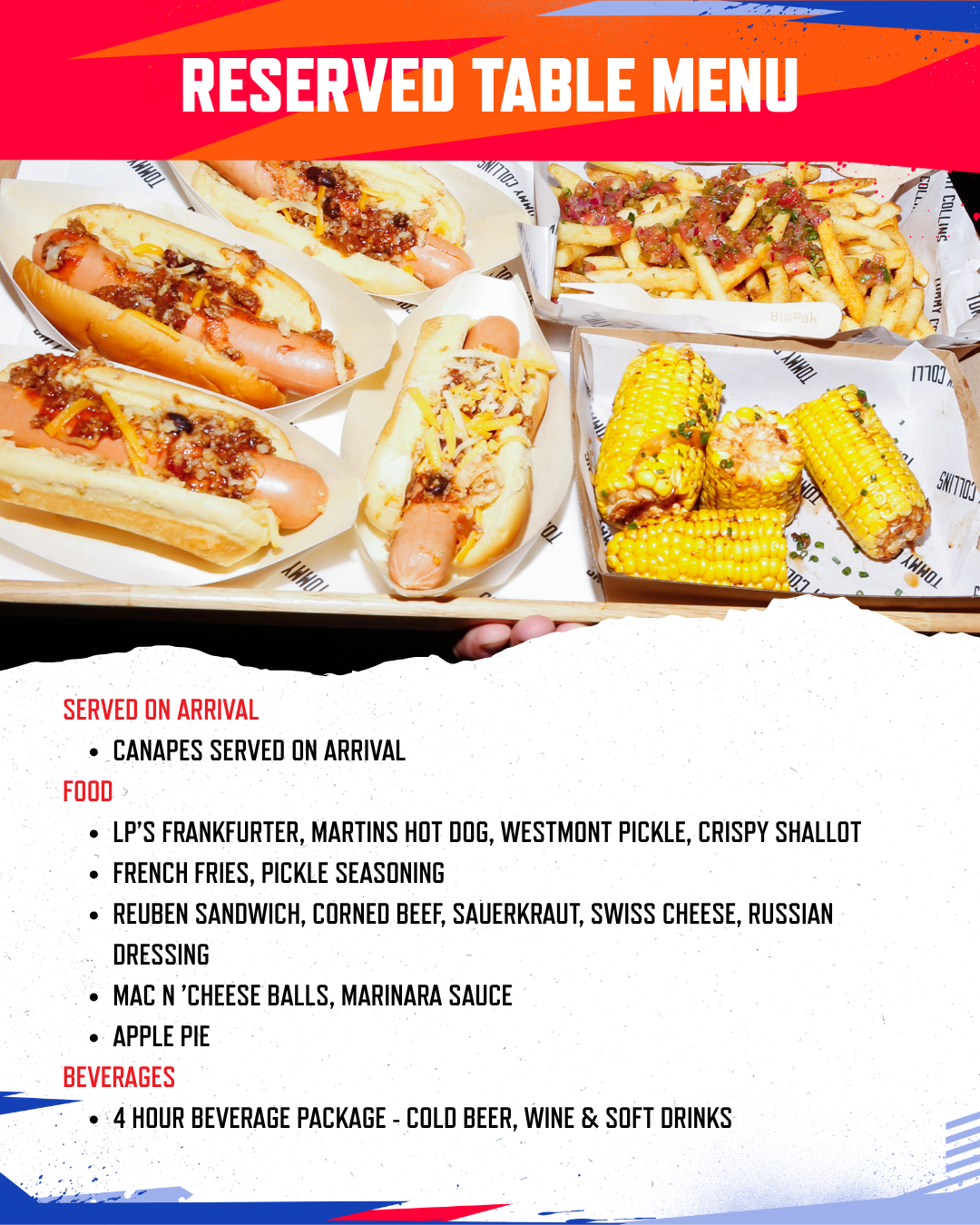 Reserved Table and Booth guests will be treated to an American feast loaded with game-day favourites and crowd-pleasing classics.