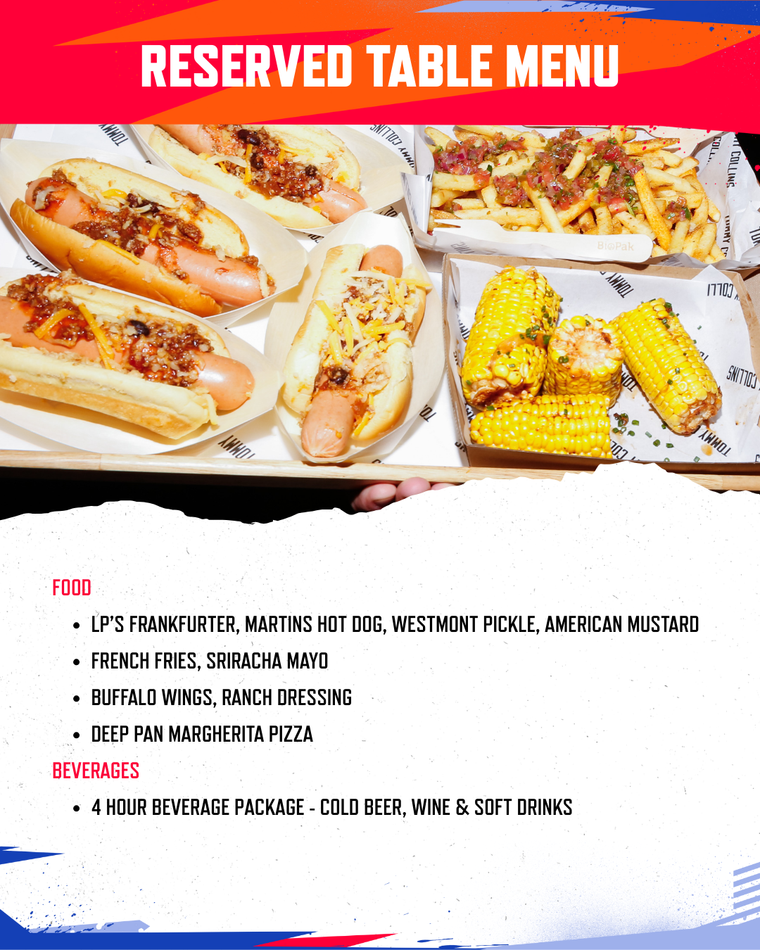 Reserved Table and Booth guests will be treated to an American feast loaded with game-day favourites and crowd-pleasing classics.